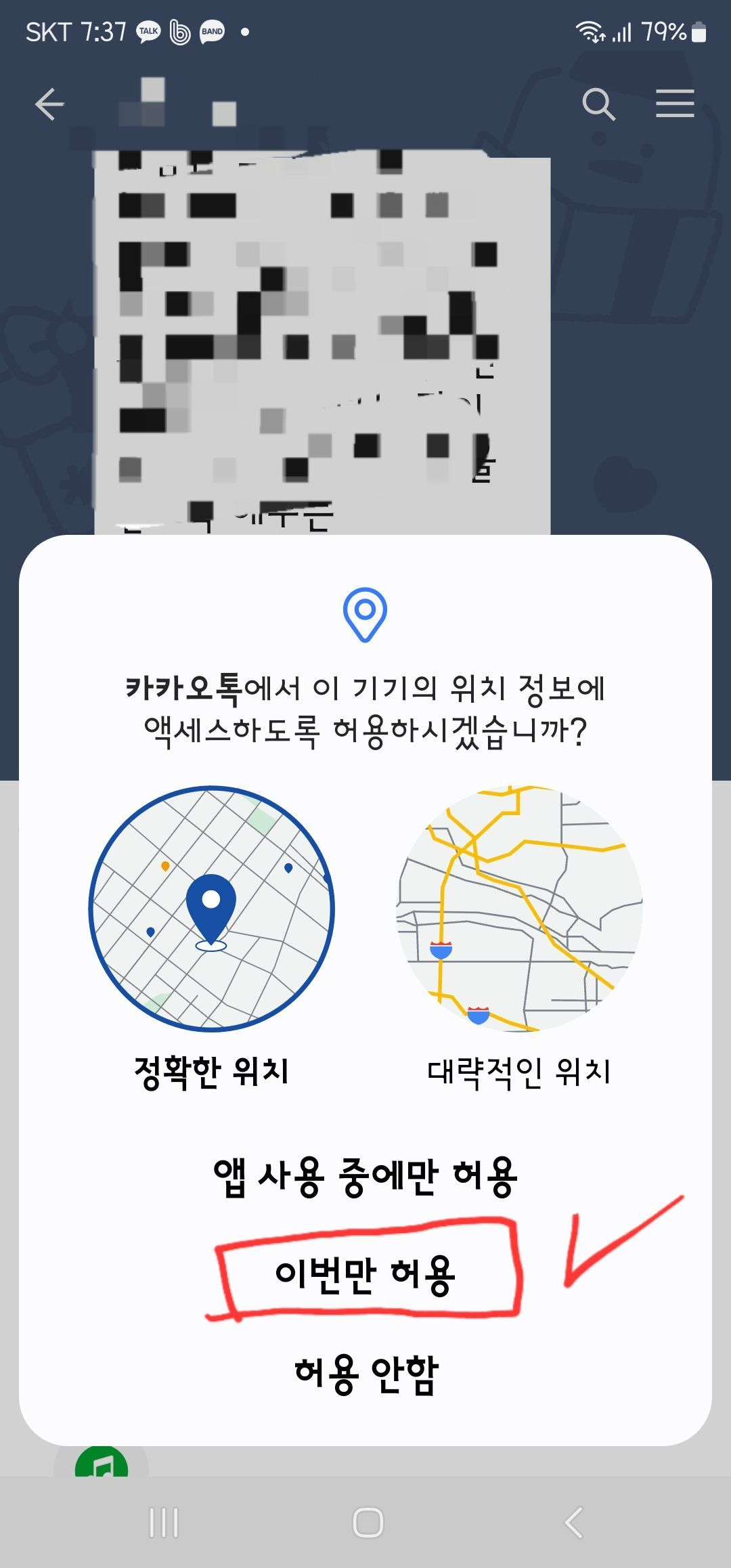 4. 카카오톡에서 이 기기의 위치 정보에 액세스하도록 허용하시겠습니까? 라고 물으면 앱사용 중에만 허용 또는 이번만 허용을 클릭합니다.