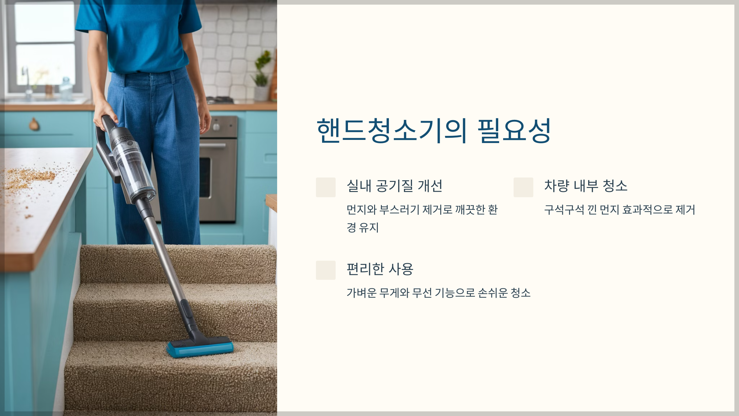 핸드청소기는 작은 부피로 빠르고 간편하게 청소하는 데 큰 도움이 됩니다. 특히 무선핸드청소기는 차량용핸드청소기로도 활용이 가능해, 애매한 공간을 청소하는 부담을 확 줄여줍니다.